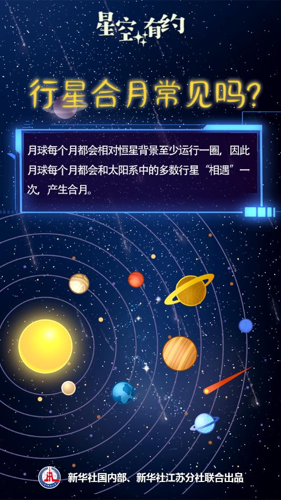 “行星合月是一種比較常見(jiàn)的天象,每個(gè)月都會(huì )發(fā)生多場(chǎng)?!蓖蹩瞥忉屨f(shuō),月球每個(gè)月都會(huì )相對恒星背景至少運行一圈,因此月球每個(gè)月都會(huì )和太陽(yáng)系中的多數行星“相遇”一次,產(chǎn)生合月。
