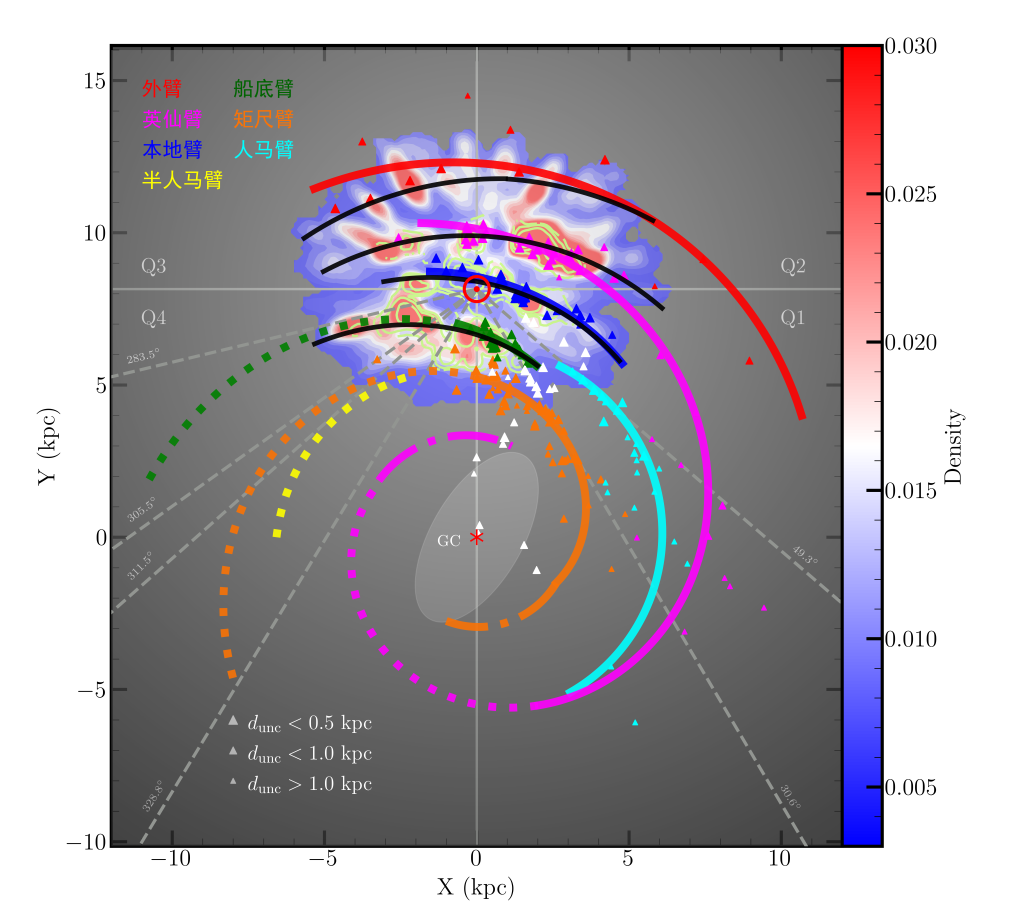“由于人類(lèi)身處銀河系中,多重結構在視線(xiàn)方向重疊,使得我們無(wú)法從‘鳥(niǎo)瞰’角度直接觀(guān)察銀河系的形態(tài)?!毙鞜罱榻B,研究團隊綜合利用目前所能獲得的全部高精度天體測量數據,利用天體脈澤、年輕恒星和疏散星團等作為定位旋臂的“燈塔”,對銀河系旋臂結構進(jìn)行了重新描繪。