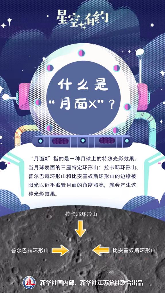 什么是“月面X”?紫金山天文臺科普主管王科超介紹,“月面X”指的是一種月球上的特殊光影效果。當月球表面的三座環(huán)形山:拉卡耶環(huán)形山、普爾巴赫環(huán)形山和比安基奴斯環(huán)形山的邊緣被陽(yáng)光以近乎貼著(zhù)月面的角度照亮,就會(huì )產(chǎn)生這種特殊的光影效果,即有類(lèi)似英文字母“X”的形狀浮現在月球表面?!霸旅鎄”最早于2004年由加拿大觀(guān)測者發(fā)現和報告。此后,這一現象受到許多天文愛(ài)好者的持續關(guān)注。