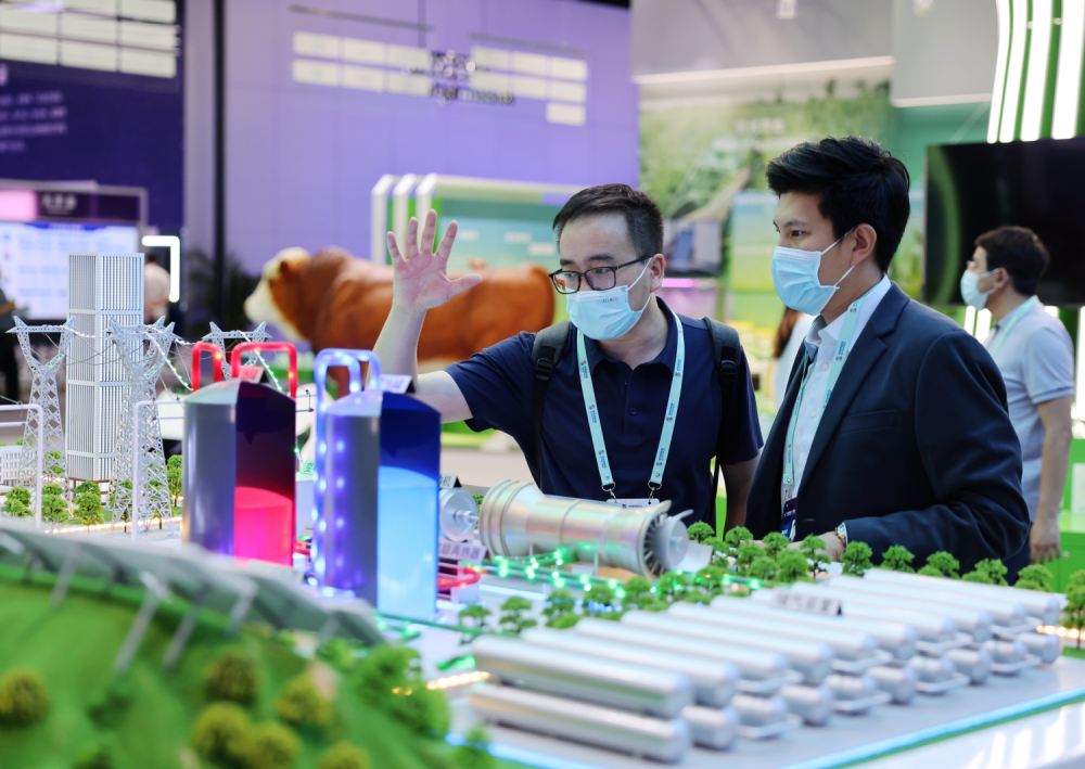 5月26日,觀(guān)眾在中關(guān)村國家自主創(chuàng )新示范區展示中心了解100MW先進(jìn)壓縮空氣儲能技術(shù)。新華社記者 張晨霖 攝