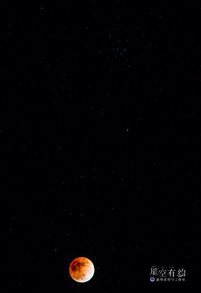 北京市天文攝影愛(ài)好者楊勇2018年2月3日在黑龍江省漠河市北紅村拍攝的月食與蜂巢星團。(本人供圖)