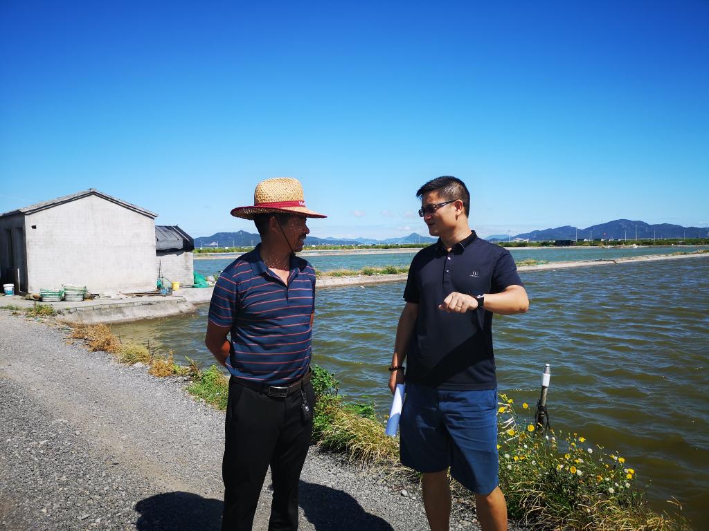 何琳(右)在寧??h為養殖戶(hù)開(kāi)展技術(shù)指導。(何京 攝)