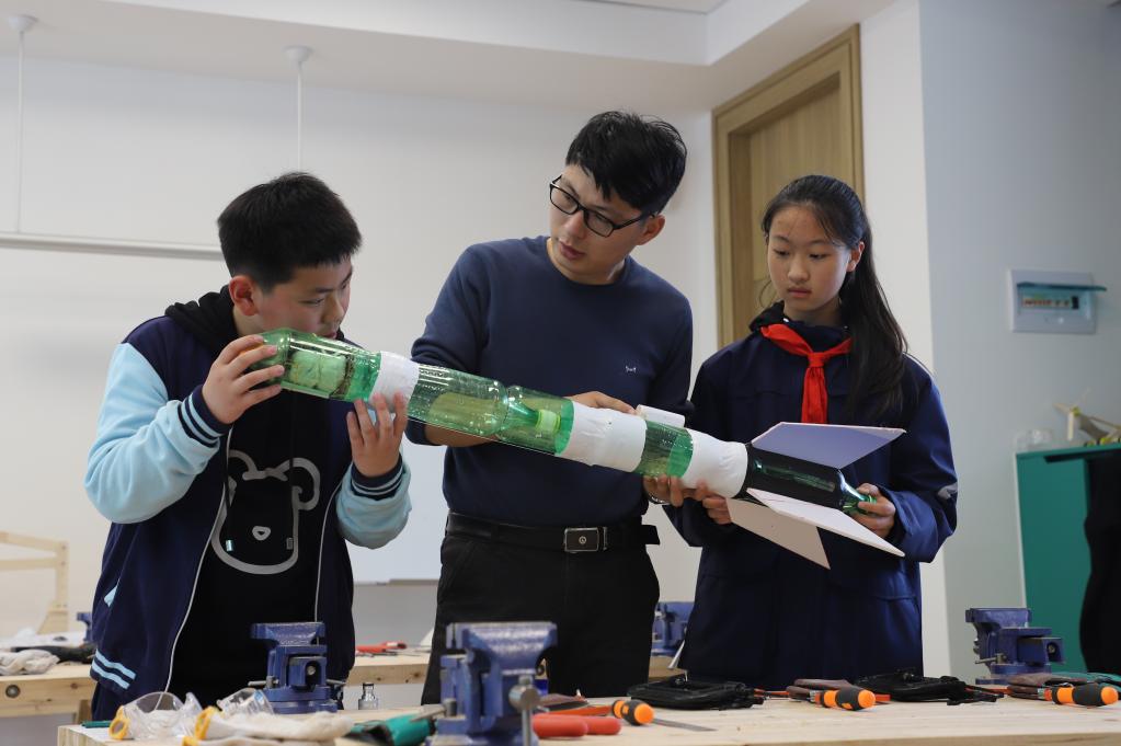 科普“網(wǎng)紅”王?。ㄖ校┡c孩子們一起用塑料瓶制作“火箭”。(受訪(fǎng)者供圖)
