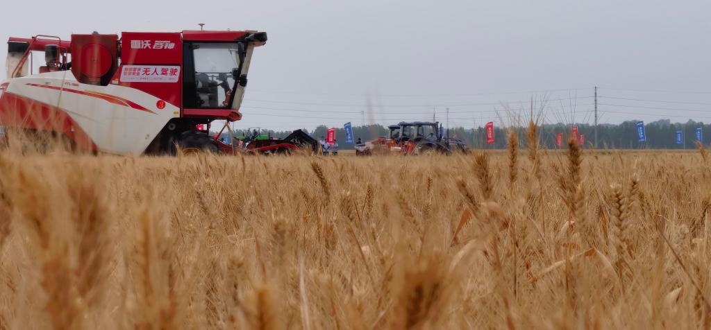 2023年中國農機推廣“田間日”活動(dòng)現場(chǎng),無(wú)人駕駛收割機正在收割小麥。新華社記者 葉婧 攝