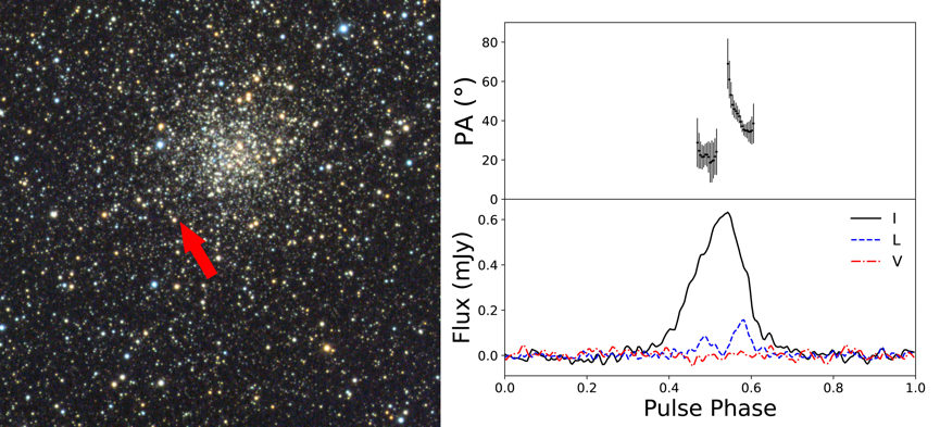 右:來(lái)自“中國天眼”觀(guān)測數據的M71E的平均脈沖輪廓和偏振位置角。(中科院國家天文臺供圖)