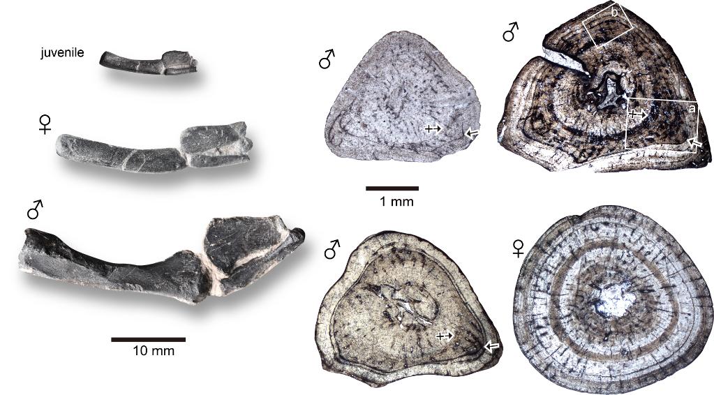 通過(guò)對比幼年個(gè)體、青春期個(gè)體及成年個(gè)體骨組織,分析骨密度和生長(cháng)速率,研究團隊得出了貴州龍在青春期快速生長(cháng)的結論,獲得了貴州龍青春期發(fā)育開(kāi)始和終止的信息:青春期雄性個(gè)體的肱骨逐漸形成了三角形中軸截面,而雌性和幼年個(gè)體肱骨中軸截面一直保持橢圓形。