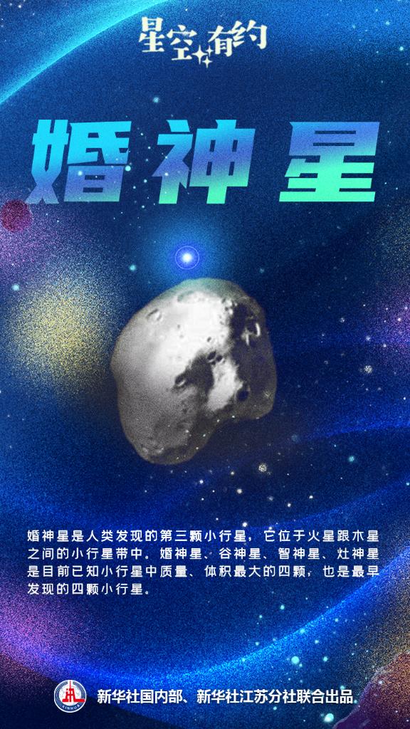 紫金山天文臺科普主管王科超介紹,婚神星是人類(lèi)發(fā)現的第三顆小行星,它位于火星跟木星之間的小行星帶中?;樯裥?、谷神星、智神星、灶神星是目前已知小行星中質(zhì)量、體積最大的四顆,也是最早發(fā)現的四顆小行星。但與月球比較,婚神星的“體形”小得多。再加上運行軌道距離太陽(yáng)很遠,婚神星的視星等在7.4至11.5等之間,僅用肉眼無(wú)法觀(guān)測。