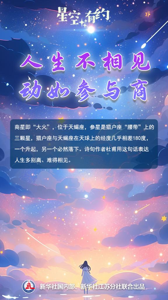 除了心宿二、“大火”、天蝎座α,這顆星還有別名“商星”。杜甫有詩(shī)云:“人生不相見(jiàn),動(dòng)如參與商?!边@句話(huà)的意思是人生多別離、難得相見(jiàn),好比此起彼落的參星與商星。王科超說(shuō),古人對星空的觀(guān)察細致入微。參星是獵戶(hù)座“腰帶”上的三顆星,它們與商星所屬的天蝎座在天球上的經(jīng)度幾乎相差180度,一個(gè)升起,另一個(gè)必然落下。