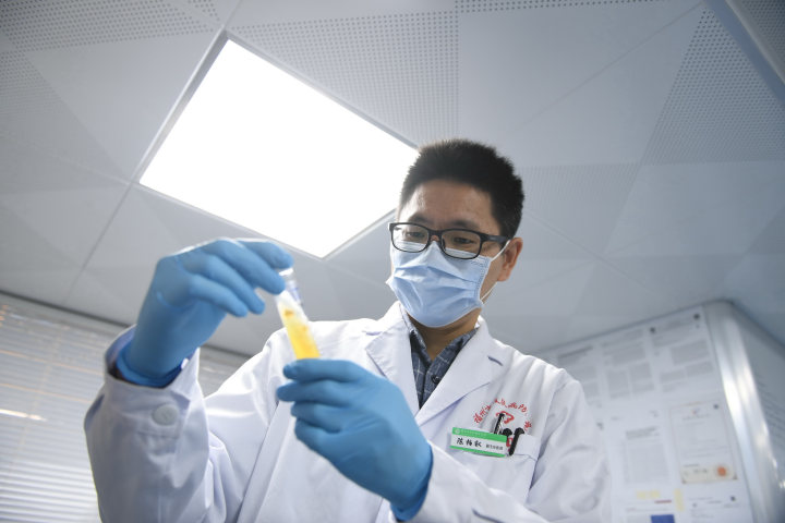 陳柏叡在福州市皮膚病防治院實(shí)驗室查看菌種培養情況。新華社記者 林善傳 攝