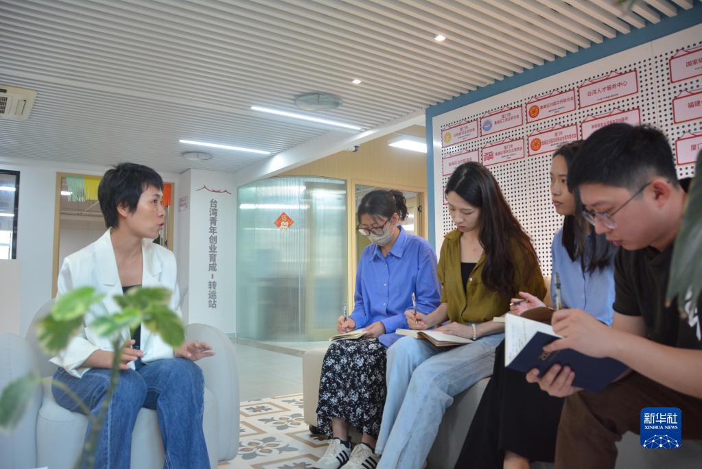 6月12日,聚融壹家臺灣青年雙創(chuàng )基地執行長(cháng)左星星(左一)在與臺青交流相關(guān)創(chuàng )業(yè)項目。新華社記者 顏之宏 攝