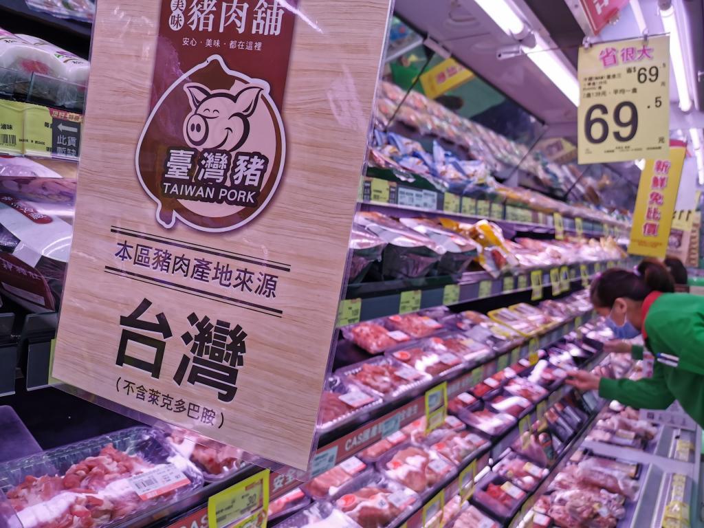 臺北市光復北路一家賣(mài)場(chǎng)內,肉品區懸掛有“臺灣豬”標識,表明不含萊克多巴胺(資料照片)。新華社發(fā)