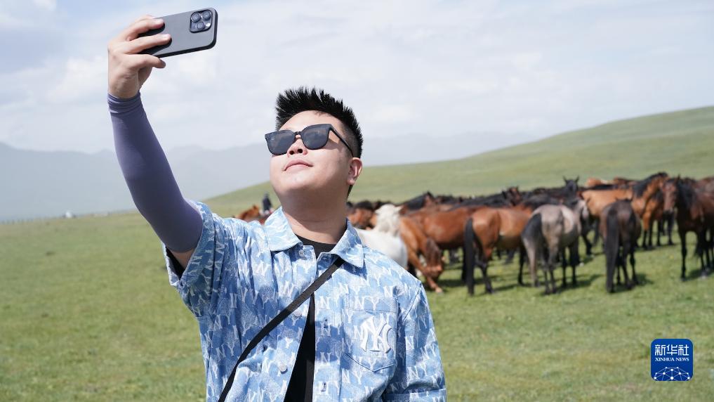 “好幸運!能夠來(lái)到這里,見(jiàn)到這么美麗的草原和駿馬!”來(lái)自臺灣的新媒體人林惟綱舉起手機,與風(fēng)姿各異的駿馬合影留念。