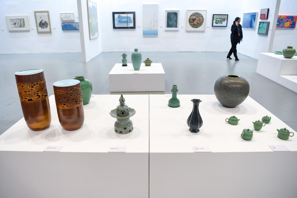 11月14日,參會(huì )嘉賓在2023兩岸企業(yè)家峰會(huì )10周年年會(huì )海峽兩岸青年當代藝術(shù)與文化創(chuàng )意展參觀(guān)。新華社記者 李博 攝