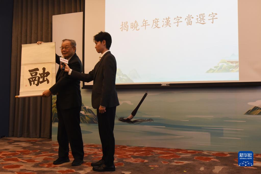 12月8日,由兩岸有關(guān)機構共同主辦的2023海峽兩岸年度漢字評選結果在臺北揭曉,“融”字以最高票當選。這是臺灣中華書(shū)學(xué)會(huì )會(huì )長(cháng)張炳煌(左)揭曉年度漢字。新華社記者 劉斐 攝