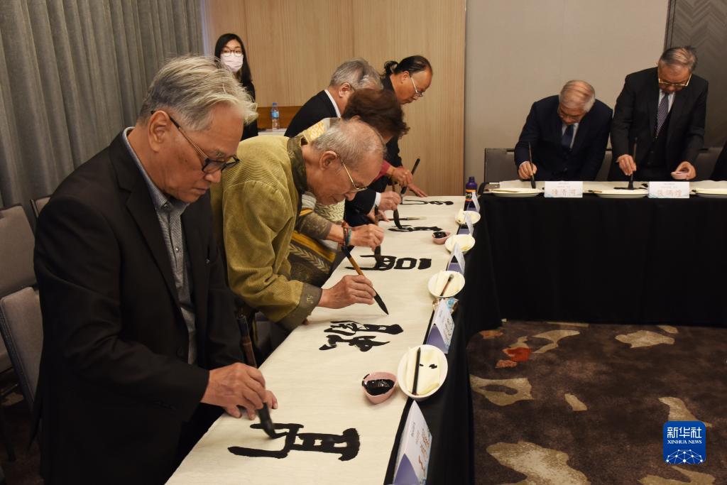 評選結果揭曉后,來(lái)自臺灣中華書(shū)學(xué)會(huì )的多位書(shū)法家和參會(huì )嘉賓現場(chǎng)潑墨揮毫,以多種字體在長(cháng)卷上共同書(shū)寫(xiě)“融”字。