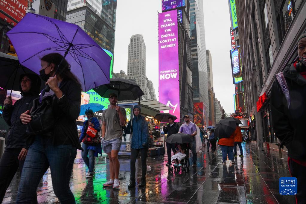 8月22日,人們行走在雨中的美國紐約時(shí)報廣場(chǎng)上。受熱帶風(fēng)暴“亨利”影響,美國紐約當日迎來(lái)降雨天氣。新華社記者 王迎 攝