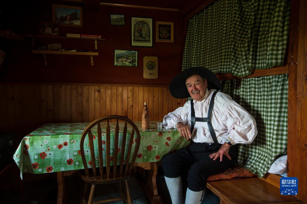 9月8日,斯洛文尼亞維利卡普拉尼那高地的老牧民彼得坐在木屋內品酒。