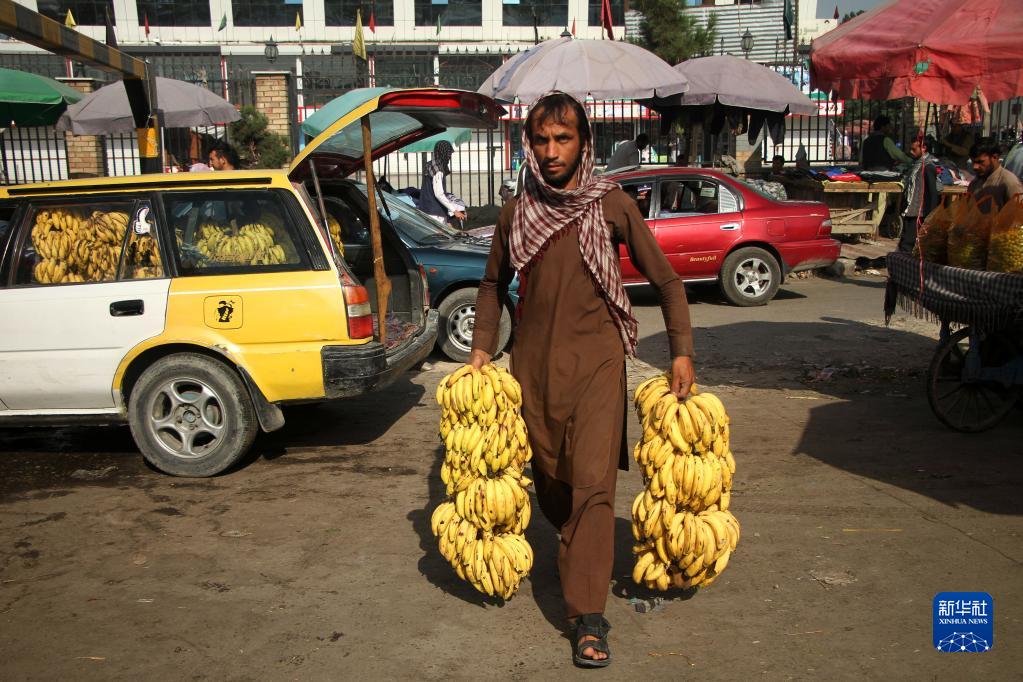 9月15日,一名阿富汗男子拎著(zhù)香蕉走在喀布爾街頭。
