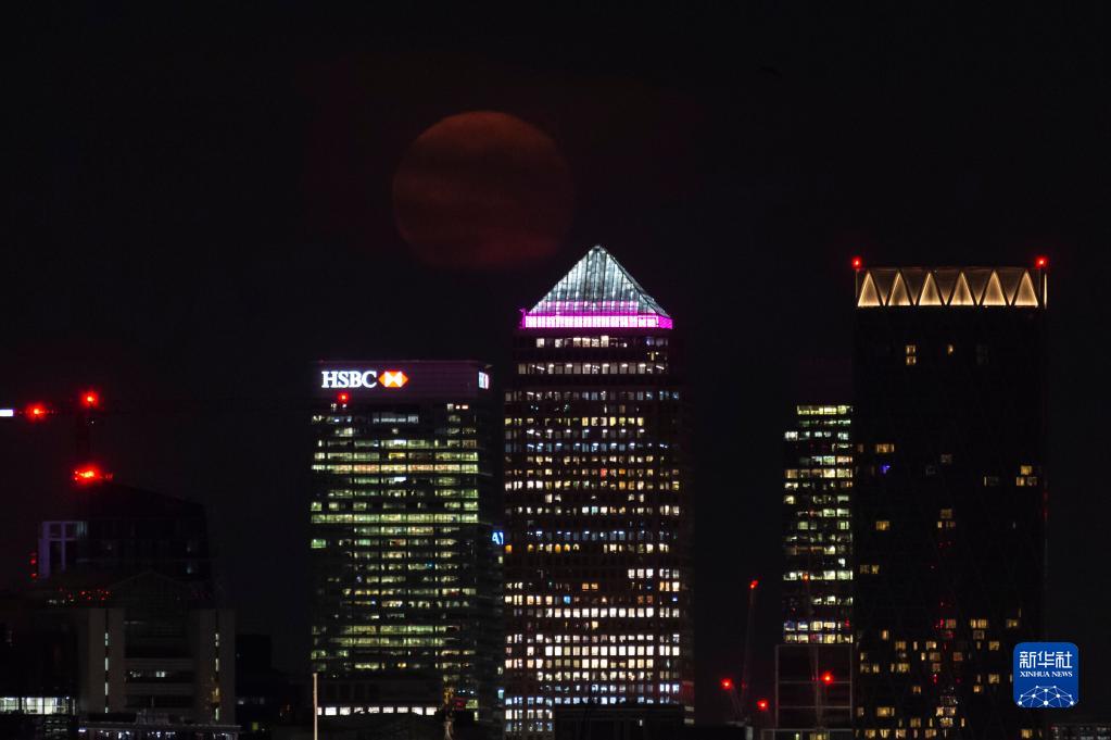 9月21日,滿(mǎn)月在英國倫敦金絲雀碼頭上空升起。