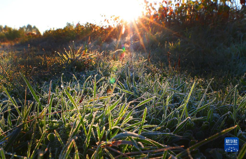 這是在白俄羅斯首都明斯克郊外拍攝的結霜的草葉(10月1日攝)。