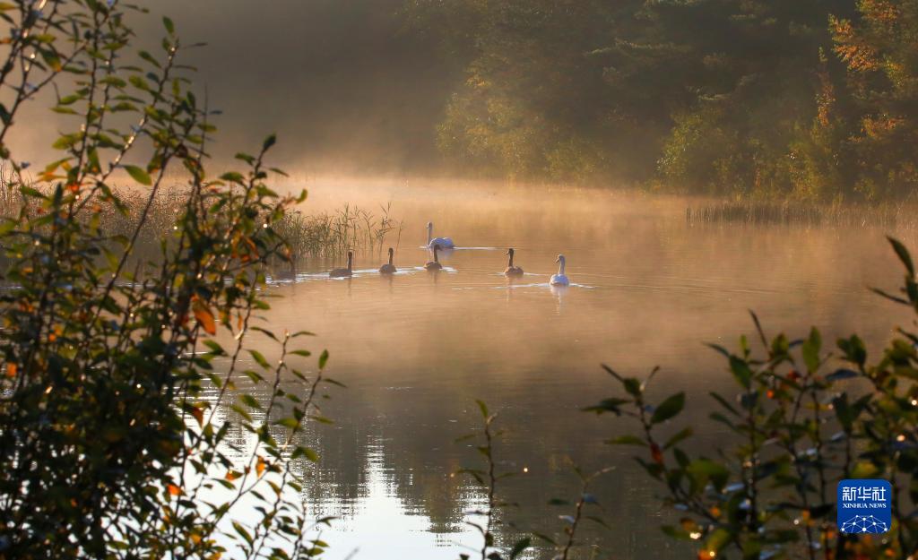 10月1日,水禽在白俄羅斯首都明斯克郊外的水面上游弋。