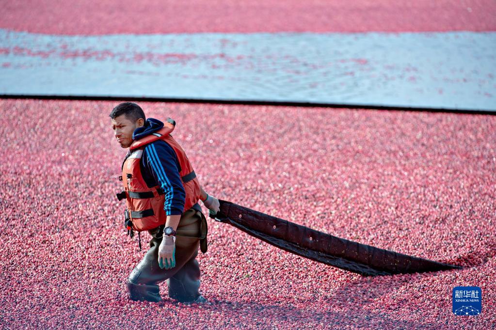 10月19日,農民在加拿大里士滿(mǎn)收獲蔓越莓。