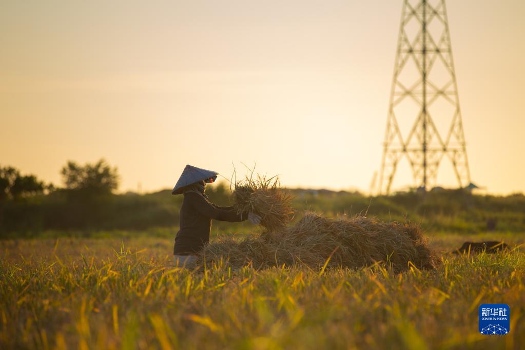 10月25日,農民在老撾萬(wàn)象城邊的田地里收割稻谷。