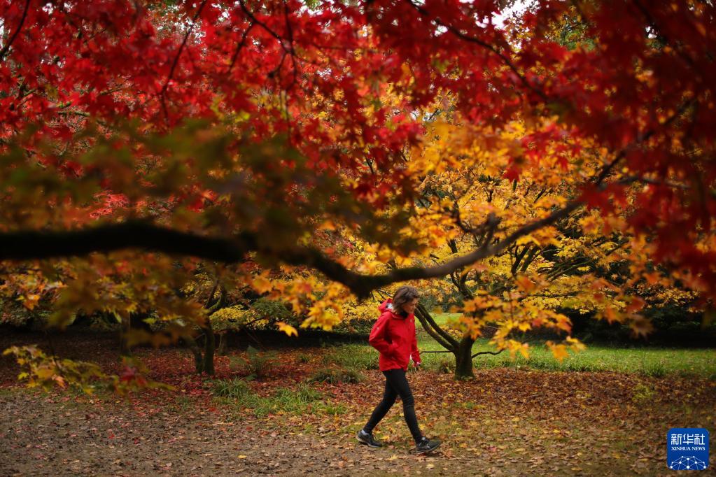 10月27日,游客在英國格洛斯特郡的韋斯頓伯特植物園欣賞秋景。