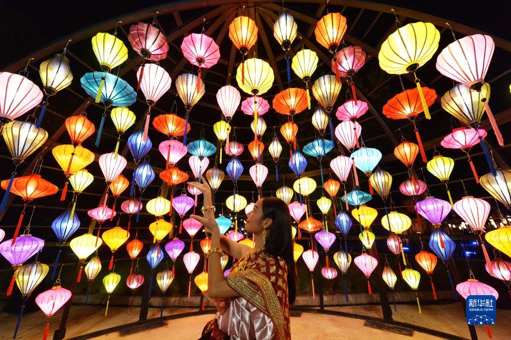 11月8日,游客在泰國北欖府舉行的國際燈籠美食節預展活動(dòng)上觀(guān)賞燈籠。
