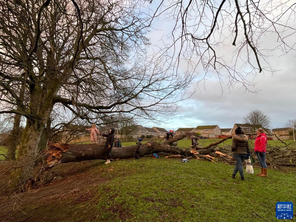 12月8日,在英國蘇格蘭北部城市阿伯丁,兒童在被吹倒的大樹(shù)上玩耍。