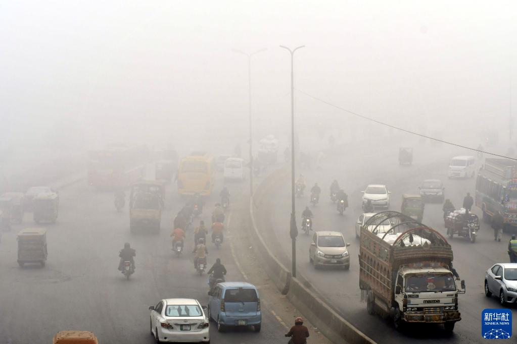 12月15日,機動(dòng)車(chē)在大霧彌漫的巴基斯坦拉合爾街頭行駛。