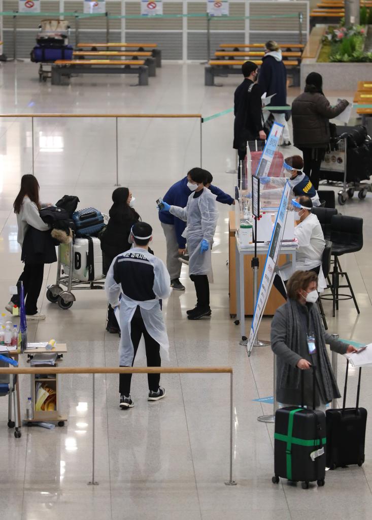 2021年12月29日,海外入境人員進(jìn)入韓國仁川國際機場(chǎng)1號航站樓到達大廳。(新華社/紐西斯通訊社)