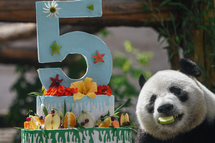 2021年7月31日,在俄羅斯莫斯科動(dòng)物園,大熊貓“如意”享用工作人員為它準備的“生日蛋糕”。新華社發(fā)(葉甫蓋尼·西尼岑攝)