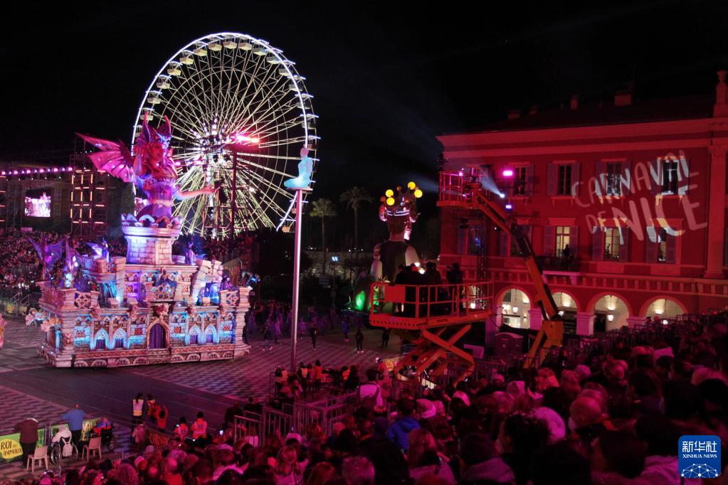 這是2月12日在法國南部城市尼斯拍攝的狂歡節花車(chē)夜間游行現場(chǎng)。