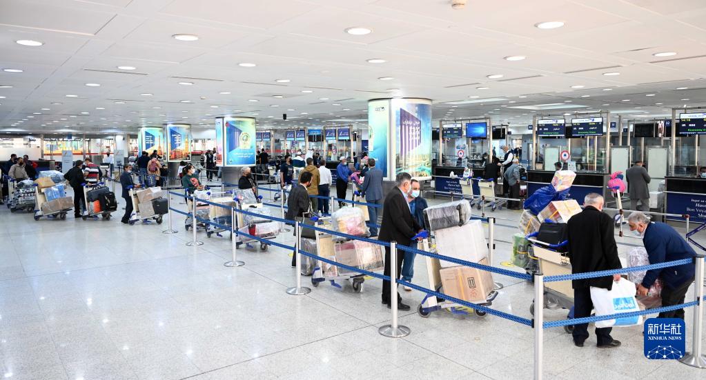 2月20日,在科威特費爾瓦尼耶省的科威特國際機場(chǎng)出發(fā)大廳,旅客排隊辦理登機手續。
