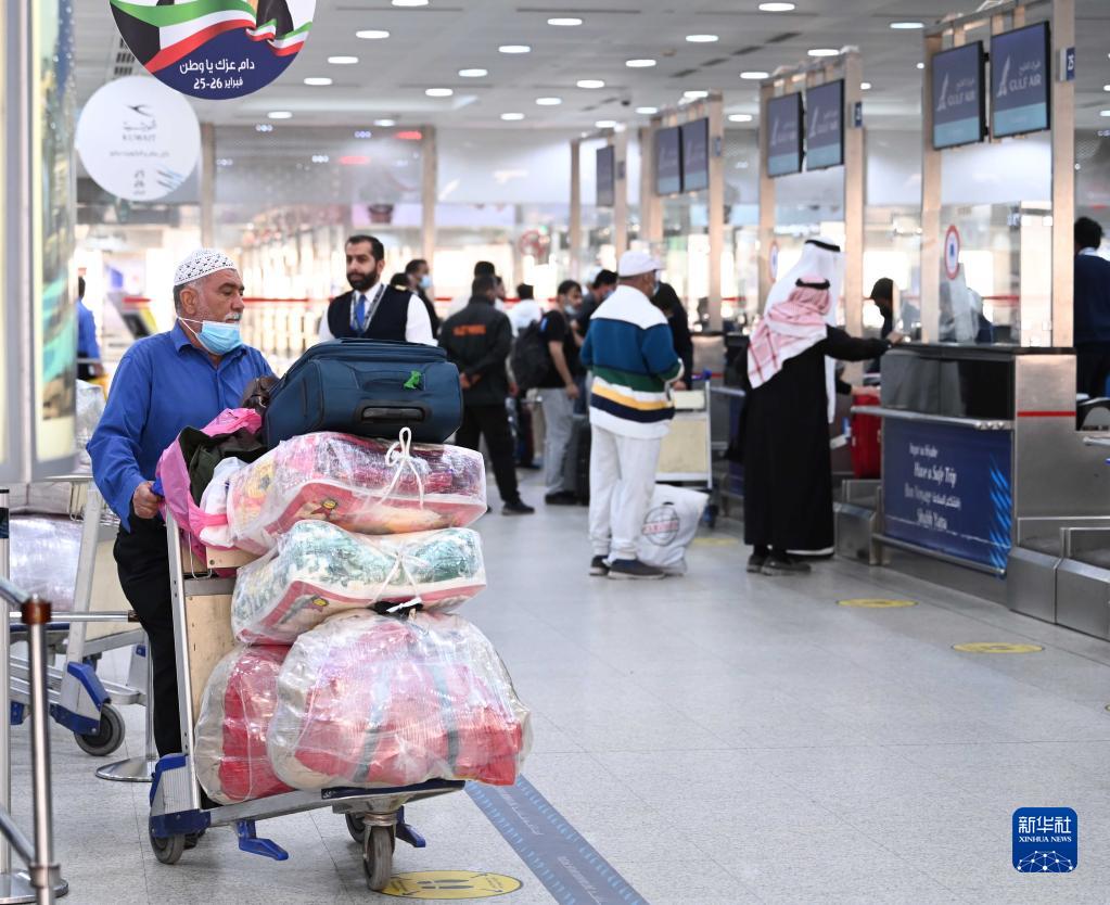 2月20日,在科威特費爾瓦尼耶省的科威特國際機場(chǎng)出發(fā)大廳,旅客辦理登機手續。
