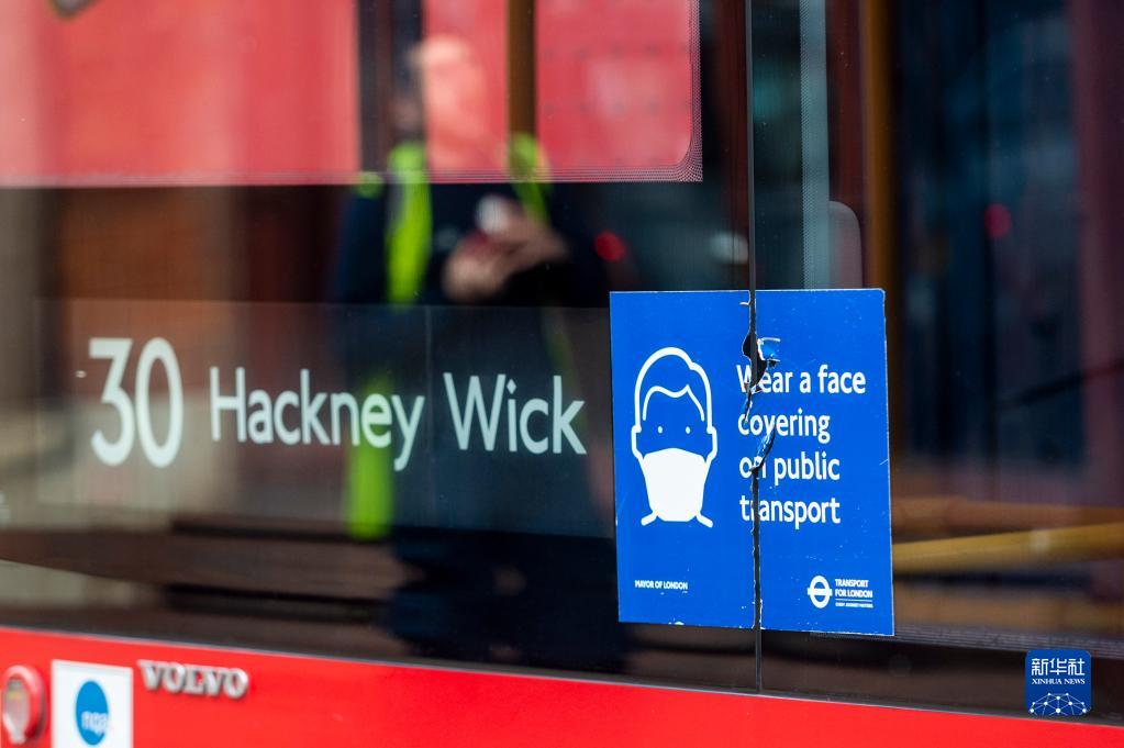 這是2月21日在英國倫敦拍攝的一輛公共汽車(chē)上破裂的佩戴口罩告示。