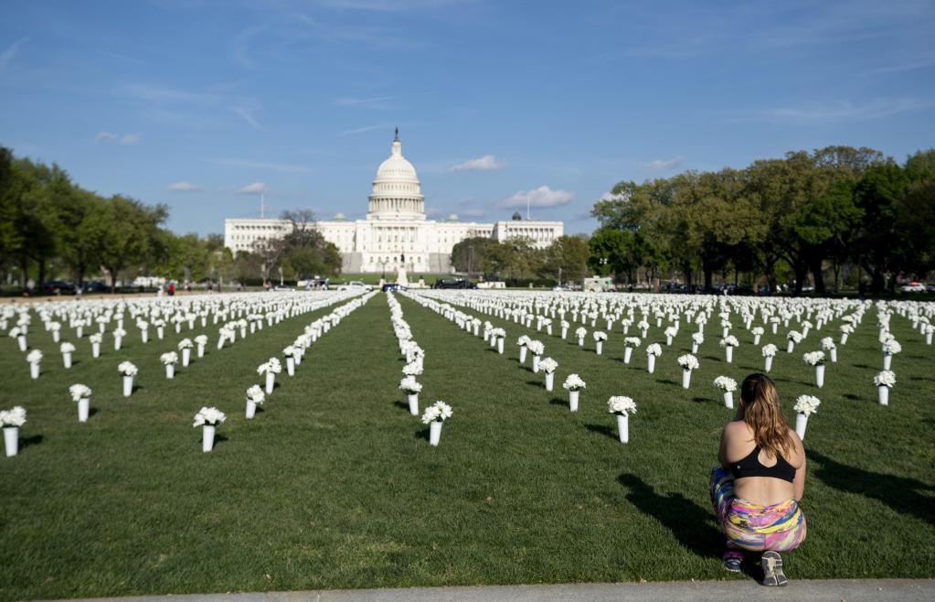 2021年4月13日,一名女子觀(guān)看美國華盛頓國家廣場(chǎng)草坪上擺放的白色絹花。新華社記者 劉杰 攝