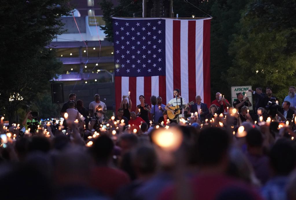 2019年8月4日,在美國俄亥俄州代頓市,人們?yōu)闃寭羰录鲭y者舉行悼念活動(dòng)。美國俄亥俄州代頓市8月4日凌晨發(fā)生一起槍擊事件,造成包括槍手在內的至少10人死亡。新華社記者 劉杰 攝