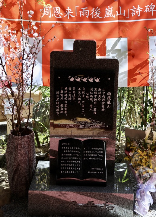 1979年4月,為慶祝中日締結和平友好條約,日本友好團體在嵐山龜山公園建造的《雨中嵐山》詩(shī)碑揭幕。四十多年來(lái),前往瞻仰的中日兩國民眾絡(luò )繹不絕。青松、櫻樹(shù)環(huán)抱之中,總理詩(shī)碑早已成為中日友好的象征。