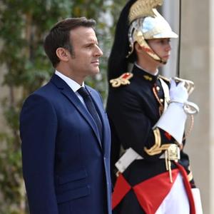 5月7日,在法國巴黎愛(ài)麗舍宮,法國總統馬克龍檢閱儀仗隊。(新華社發(fā))