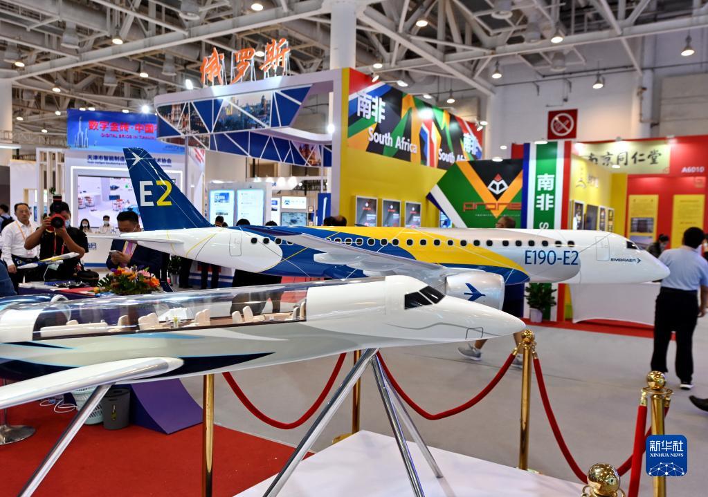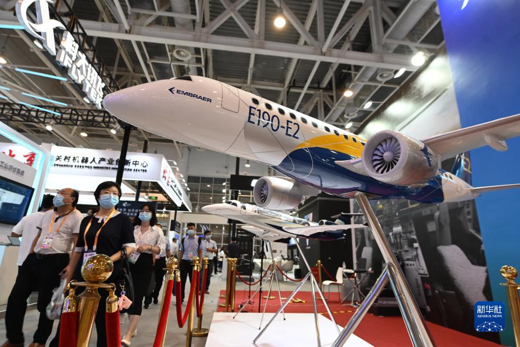 參觀(guān)者從2021金磚國家新工業(yè)革命展展出的飛機模型前走過(guò)(2021年9月8日攝)。新華社記者 林善傳 攝