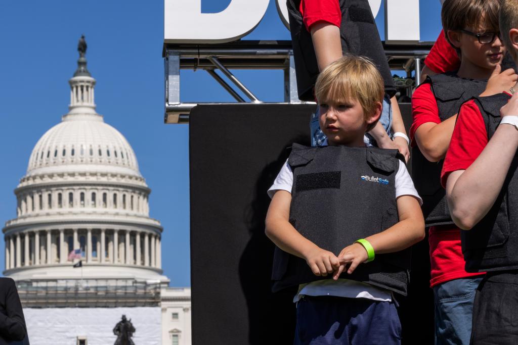 6月6日,學(xué)生們身穿防彈衣在美國華盛頓的國會(huì )大廈前參加名為“不要回避”的抗議活動(dòng),呼吁立法機構正視美國槍擊案頻發(fā)的社會(huì )問(wèn)題,要求加強槍支管控立法。新華社發(fā)(亞倫攝)
