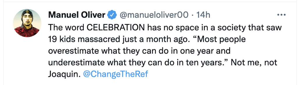 奧利弗的社交媒體賬號至今仍以?xún)鹤拥男は褡鳛轭^像。就在應邀出席白宮這場(chǎng)“慶功會(huì )”前,他在社交媒體上發(fā)文說(shuō):“美國一個(gè)多月前才發(fā)生了一場(chǎng)造成19個(gè)孩子遇害的槍擊慘案,現在可不應該使用‘慶?!@個(gè)詞?!?/strong>