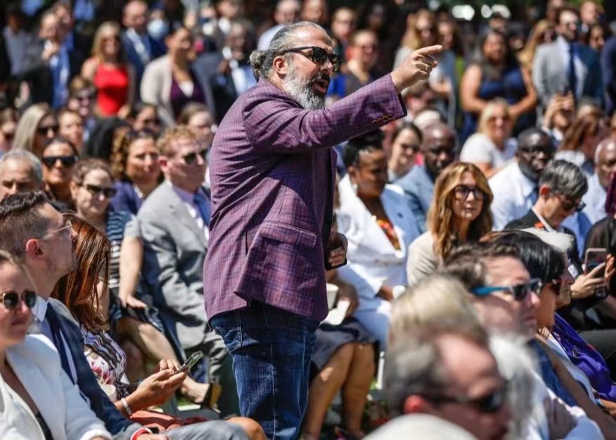 11日“慶功會(huì )”現場(chǎng),拜登正在講話(huà)時(shí),觀(guān)眾席上突然站起一名中年男子,高聲喊話(huà)?!白?,聽(tīng)我把話(huà)說(shuō)完?!卑莸钦f(shuō)。不過(guò),抗議者沒(méi)有停下來(lái)的意思。拜登停頓了幾秒,抿了抿嘴唇??棺h者喊道:“必須做得更多!這話(huà)我都已對你們說(shuō)了很多年!”觀(guān)眾席上,很多人為他鼓掌。工作人員隨即上前要求他離開(kāi)現場(chǎng)。他一個(gè)轉身,頭也不回地向外走去。