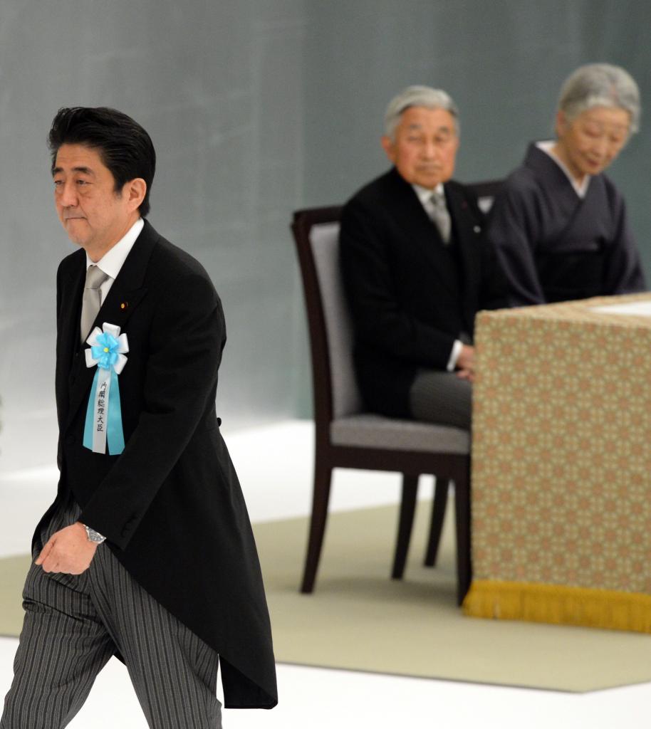 2015年8月15日,在日本東京武道館,出席“全國戰歿者追悼?jì)x式”的時(shí)任日本首相安倍晉三(左)從時(shí)任日本天皇明仁夫婦身旁走過(guò)。新華社記者馬平攝