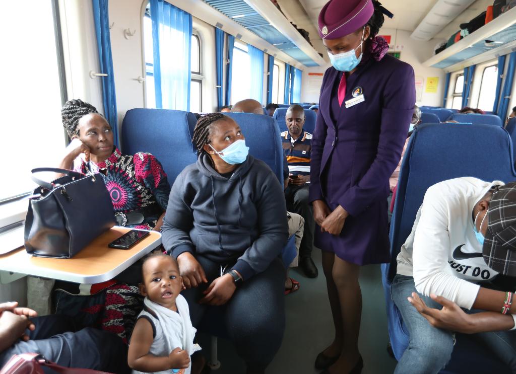 7月29日,列車(chē)員菲奧娜(站立者)在蒙內鐵路客運列車(chē)上與乘客交流。新華社記者董江輝攝