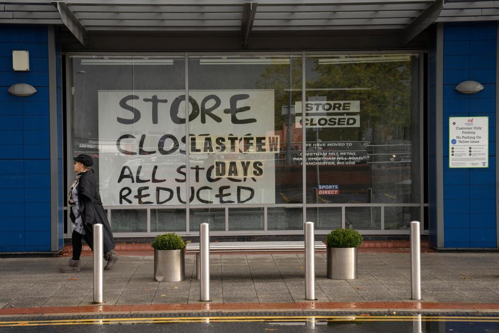 10月7日,在英國曼徹斯特,一名行人走過(guò)一家關(guān)閉的店鋪。新華社發(fā)(喬恩·休珀攝)