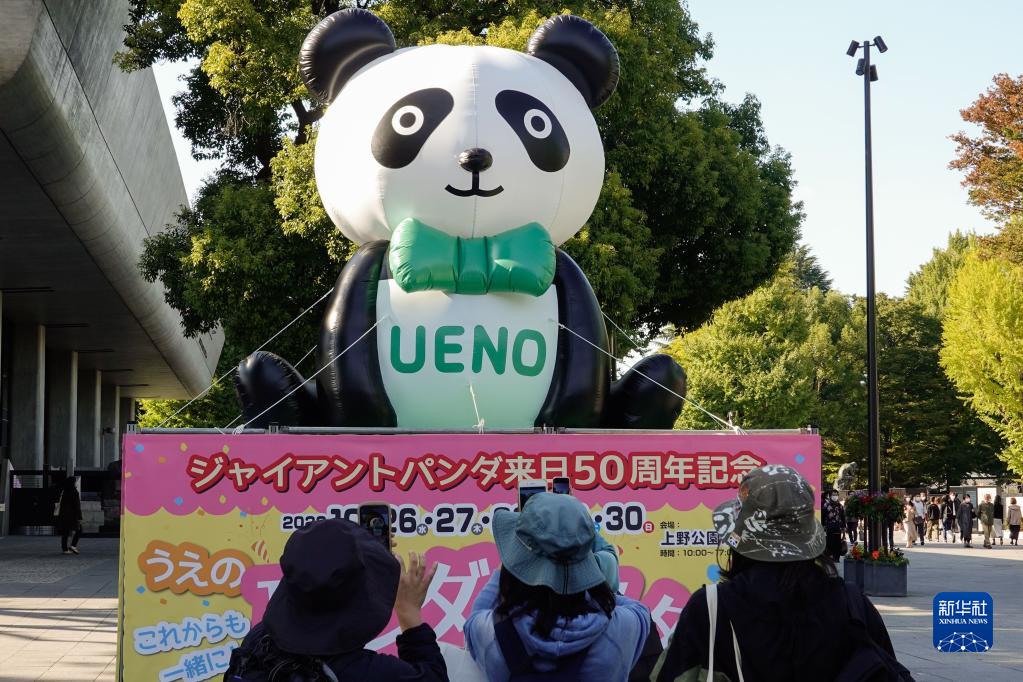 這是10月28日在日本東京上野車(chē)站出口拍攝的慶祝大熊貓旅日50周年的氣球。新華社記者 張笑宇 攝