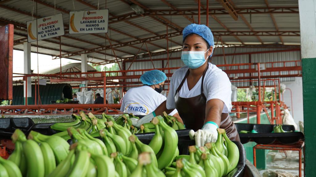 2022年初,在厄瓜多爾洛斯里奧斯省一處種植基地,工人們忙碌有序地處理著(zhù)待出口的香蕉。